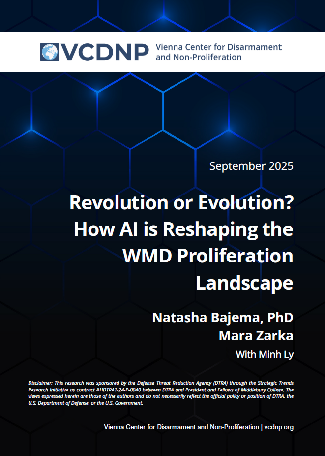 The VCDNP paper authored by Dr. Natasha Bajema, Senior Research Associate at the James Martin Center for Nonproliferation Studies, and Mara Zarka, VCDNP Research Associate, examines the intersections between AI and WMD with a view to providing policymakers with astructured guide for thinking about this emerging threat space. The publication draws on a one-year technical study mapping potential risks at the AIWMD nexus over the next five to ten years.